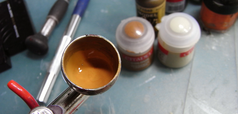 Ich habe also die Taus auf weißer Grundierung mit einer Grundschicht Bleached Bone + Snakebite Leather begonnen. Ich plane in diesem Fall, nur die Rüstungsteile und Bases zu airbrushen, alles andere später von Hand zu bemalen. Ich verdünne die Farbe im Airbrush wie schon erklärt. Ich versuche immer, 65 – 70% Farbe und rund 30% Wasser hinzubekommen. Wenn du mit z dünner Farbe arbeitest, wird deine Düse spritzen oder die Schicht deckt nicht auf der Oberfläche, an der du arbeitest. Ich arbeite für mich nach der Regel, dass 2 Schichten der Grundfarbe 100% deckend sein sollten, um weiterzuarbeiten. Warte zwischen diesen 2 Schichten, bis die erste trocken ist.