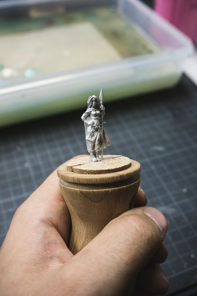 This is how it will look with a miniature mounted on the holder. You can mount the miniature with its tag like I did in this example although this is actually quite impractical. You will have to cut it off after the miniature is finished and also the tag is already a bit thick to fit it into that cork. Much better is the second option, by cutting the tag off and just using a wire pin. The miniature will still be hold safely and you don´t have to remove the tag after finishing the miniature.