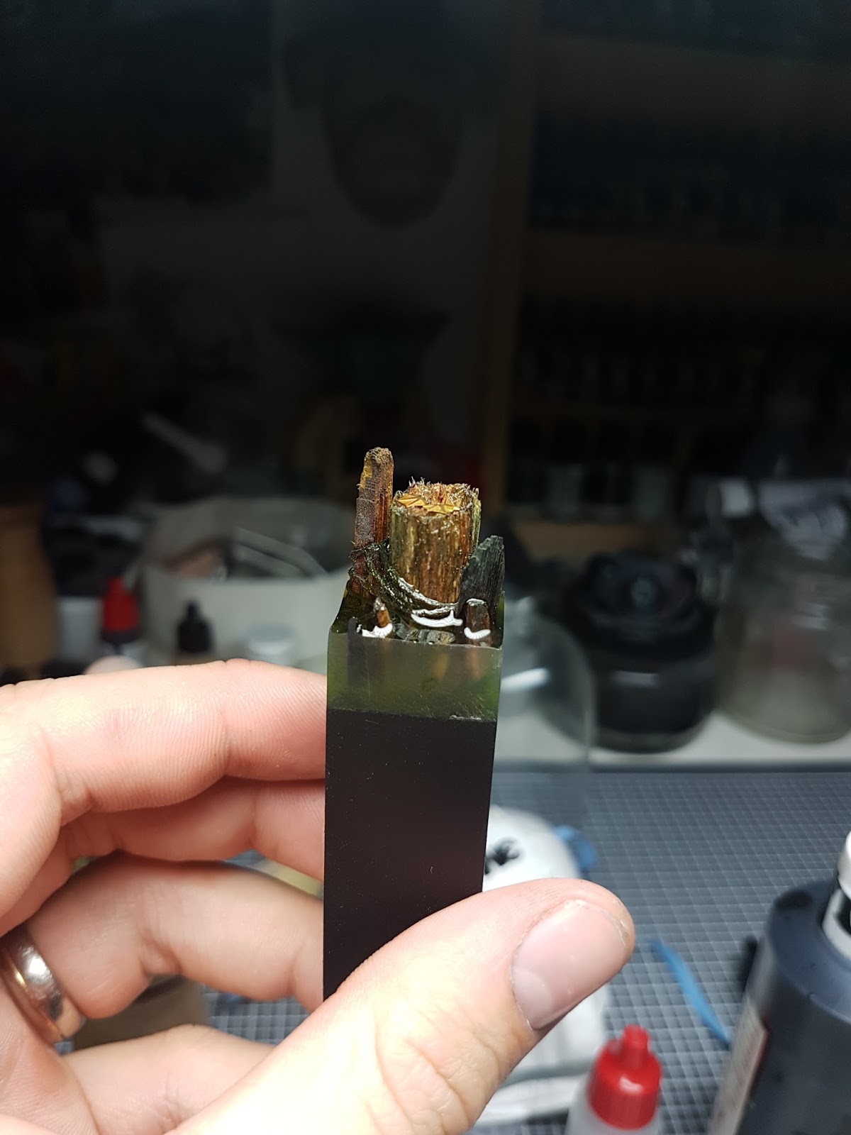 To remove air bubbles there are two ways I learned during my resin pours. If you gently blow over the surface with a hairdryer you will see the bubbles start working the way to the top. Please make sure the distance between your blow dryer and the base is long enough, first that you not blow the resin right out of it…. Believe me I know why I tell you this. The second is a bit riskier and now you will understand why I told you to create all sort of foliage work after the pour. Take a lighter and slowly work your flame over the surface this will eliminate the bubbles as well. IMPORTANT: Please work responsibly with fire do not use the lighter technique if you already have some static grass or a Miniature on the base.
